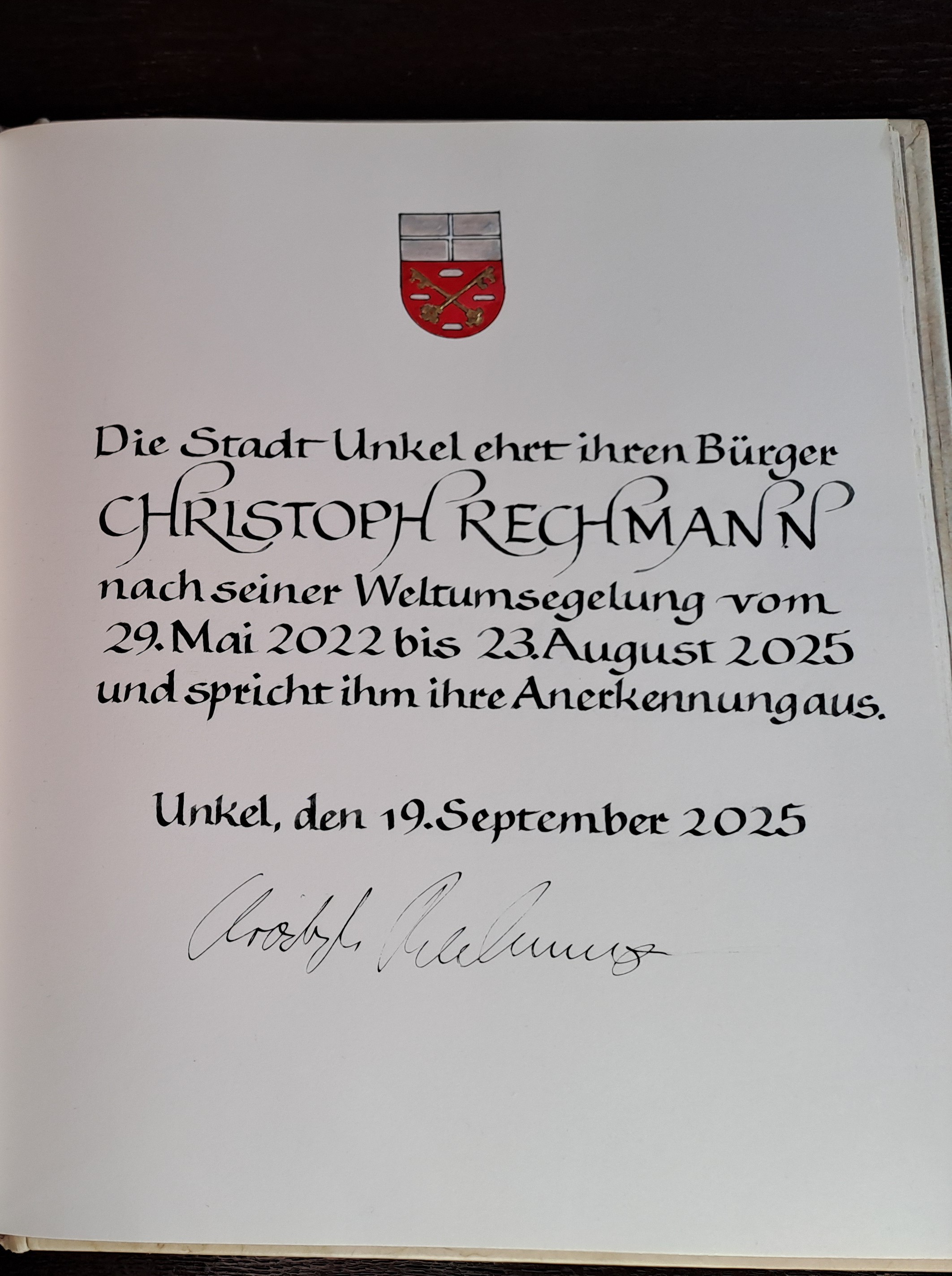 Die längste Strecke, die Christoph Rechmann allein am Stück segelte, war die Pazifik-Überquerung: 4.200 Seemeilen in 31 Tagen. Insgesamt hat er 463 Tage auf See verbracht und 42.000 Seemeilen zurückgelegt. „Das sind beeindruckende Zahlen, das ist eine beeindruckende Leistung – und diese Leistung unseres Bürgers und Unkeler Geschäftsmannes Christoph Rechmann wollen wir heute mit der Eintragung in das Goldene Buch der Stadt Unkel ehren“, erklärte Stadtbürgermeister Alfons Mußhoff.