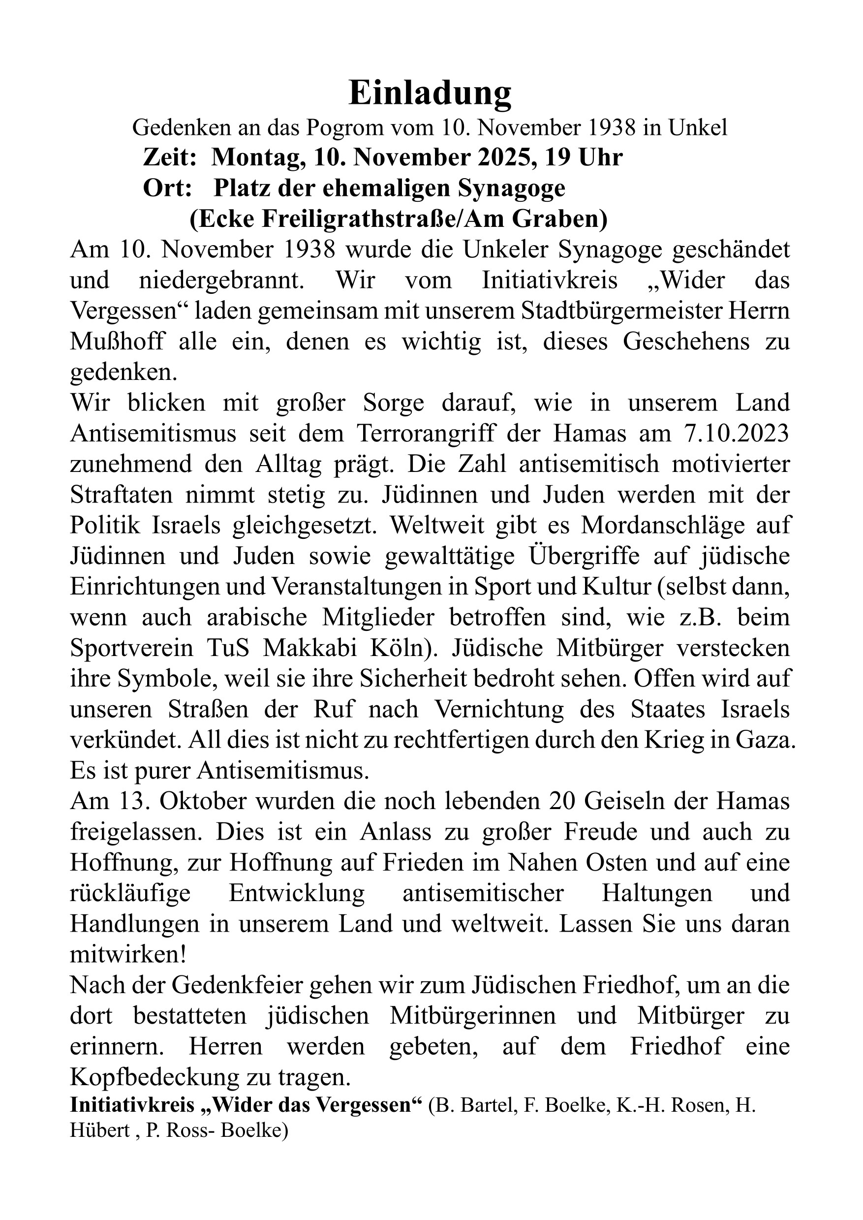 Gedenken an das Pogrom am 10. November 1938 in Unkel