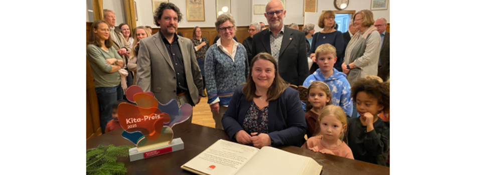 "Der Eintrag in das Goldene Buch der Stadt ist eine große Ehre und zugleich ein Moment der Dankbarkeit und des Stolzes", sagte Kita-Leiterin Claudia Gries. Der Gewinn des Deutschen Kita-Preises sei eine außergewöhnliche Auszeichnung. "Aber er ist vor allem auch eines: Eine Anerkennung für tägliches Engagement und für die Überzeugung, dass Kinder ernst genommen werden müssen, mit ihren Ideen, mit ihren Gefühlen und mit ihrer Sicht auf die Welt. Er macht sichtbar, was bei uns jeden Tag gelebt wird: Eine Haltung, die Kinder in ihrer Vielfalt sieht, die ihnen zuhört und ihnen zutraut, ihre Welt aktiv mitzugestalten". Der Preis gehöre einem ganzen Team, "das jeden Tag mit Herz, Fachlichkeit und Mut arbeitet, das neue Wege geht, sich hinterfragt, miteinander lacht, diskutiert, lernt und auch in herausfordernden Zeiten zusammensteht. Danke für Eure Leidenschaft, Professionalität und unermüdlichen Einsatz für die Kinder", sagte Gries.
