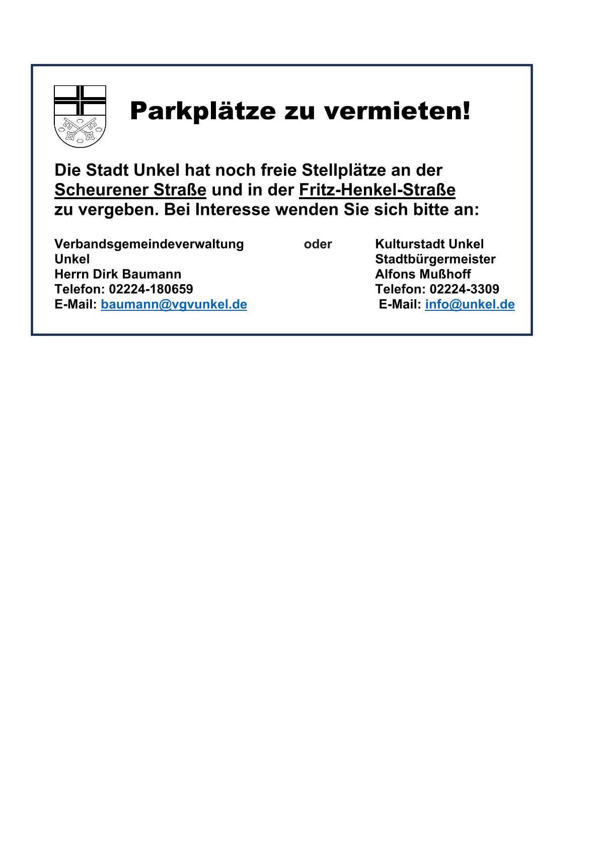 In Unkel-Scheuren und in der Fritz-Henkel-Straße sind noch Parkplätze zu vermieten! Bei Interesse melden Sie sich gerne!